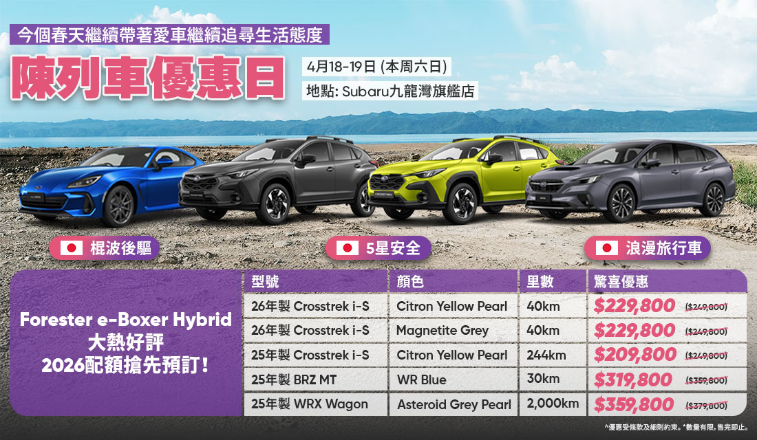 汽車可以係接送家人既工具,亦可裝載著夢想追求!陳列車試駕車驚喜優惠,滿足不同需求及生活態度,包括人氣SUV Crosstrek豪華版、BRZ手波及男仕浪漫旅行車WRX Wagon。全系列由日本製造,榮獲多個國際安全5星獎項,頂級品質與超卓安全兼備,保護家人安心!#試過您就知正 !